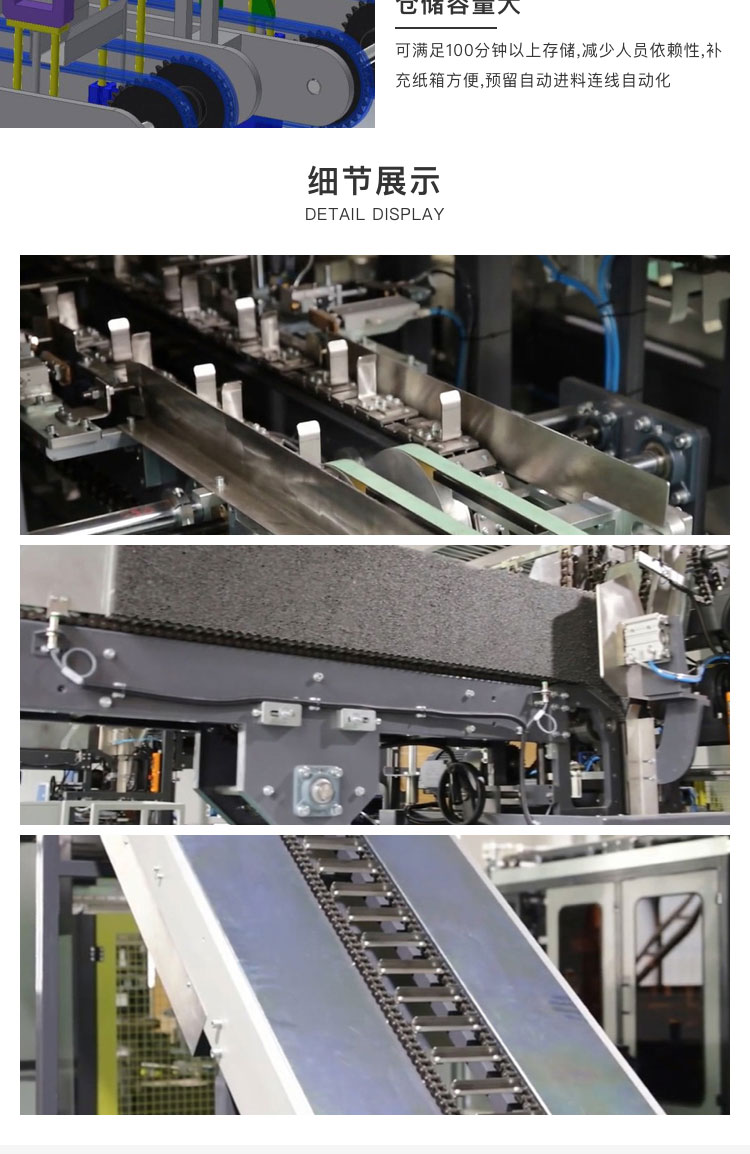介紹:HW-HT-XH01A采用多吸盤(pán)連續(xù)式吸盤(pán)吸盒,整機(jī)由PLC人機(jī)界面控制,采用了鏈排式連續(xù)運(yùn)動(dòng)原理,從而保證了高速運(yùn)行的穩(wěn)定性。依據(jù)客戶對(duì)產(chǎn)品所需做聯(lián)機(jī)儲(chǔ)備接口。物料通過(guò)輸送電機(jī)驅(qū)動(dòng)階梯式機(jī)械吸盤(pán)動(dòng)作經(jīng)轉(zhuǎn)輪至裝盒機(jī)輸送系統(tǒng)上,并在這個(gè)過(guò)程中完成進(jìn)料系統(tǒng)。同時(shí)具備檢測(cè)功能,并設(shè)有自動(dòng)調(diào)節(jié)功能使之運(yùn)行速度能與前段計(jì)數(shù)包裝機(jī)的生產(chǎn)產(chǎn)能貼切匹配。該設(shè)備可與連續(xù)爐設(shè)備,膜包機(jī),裝箱機(jī)等前后道設(shè)備相連接形成一條龍包裝系統(tǒng),滿足企業(yè)生產(chǎn),降低勞動(dòng)力,節(jié)省包材等效果。