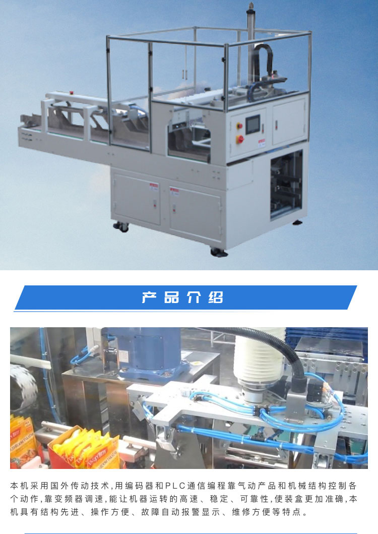 介紹:本機(jī)采用國外傳動(dòng)技術(shù),用編碼器和PLC通信編程靠氣動(dòng)產(chǎn)品和機(jī)械結(jié)構(gòu)控制各 個(gè)動(dòng)作,靠變頻器調(diào)速,能讓機(jī)器運(yùn)轉(zhuǎn)的高速、穩(wěn)定、可靠。本設(shè)備可實(shí)現(xiàn)自動(dòng)下料,開盒,關(guān)盒,黏膠等。 解決您的三大包裝難題實(shí)現(xiàn)自動(dòng)化生產(chǎn):1、大大降低企業(yè)的生產(chǎn)成本,單臺(tái)裝盒機(jī)八小時(shí)生產(chǎn)力約為3-5萬盒,按此計(jì)算每臺(tái)裝盒機(jī)可省人工為10-15人;2、人工裝盒,易污染、易出差錯(cuò).車間多一人,更是多一個(gè)污染源.人工裝盒有時(shí)會(huì)漏裝說明書或內(nèi)容物;3、提高企業(yè)生產(chǎn)力,從企業(yè)管理角度上來講,管理人難,管理設(shè)備易。 產(chǎn)品別稱:裝箱機(jī)、裝盒機(jī)、自動(dòng)裝箱機(jī)、自動(dòng)裝盒機(jī)、跌落式裝箱機(jī)、側(cè)推式裝箱機(jī)、抓舉式裝箱機(jī)、機(jī)器人裝箱機(jī)、一片式裹包機(jī)、條形全自動(dòng)裝盒機(jī)。