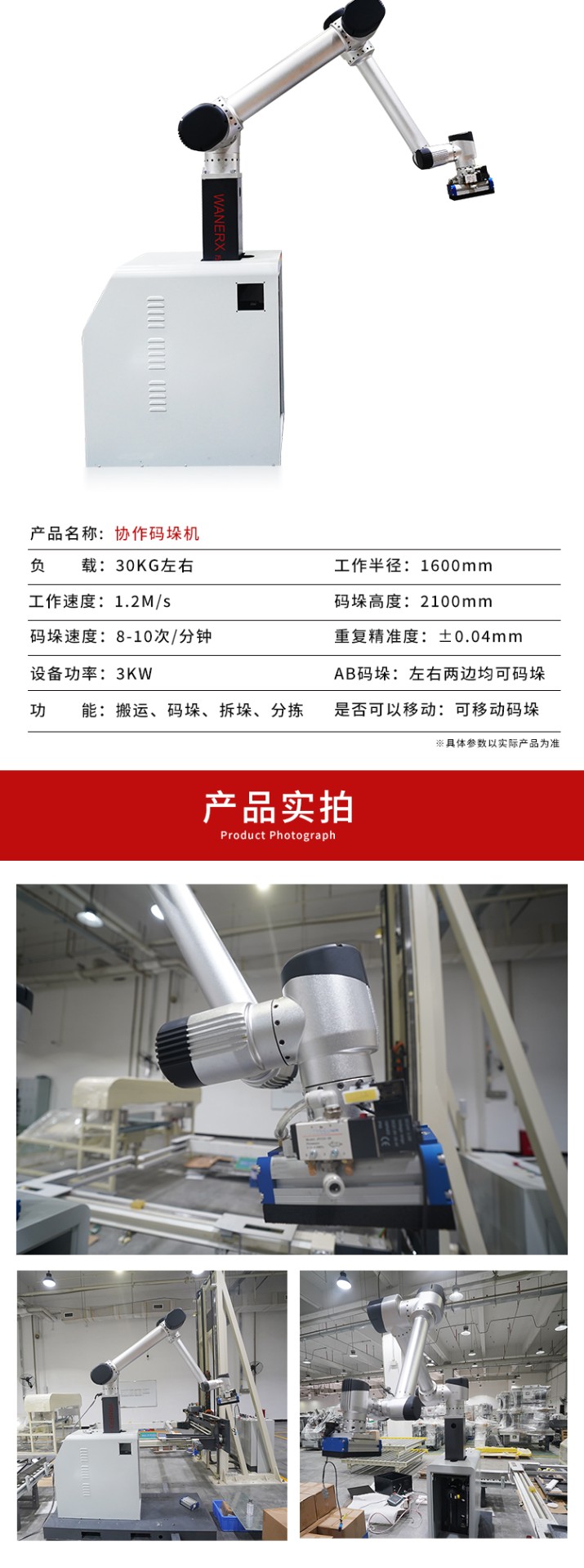 介紹:協(xié)作碼垛機(jī)器人是智能機(jī)器人,與人類工作人員緊密合作,提高生產(chǎn)效率、靈活適應(yīng)不同任務(wù)。配備傳感器,能自主學(xué)習(xí)、感知環(huán)境。廣泛應(yīng)用于紙箱、醫(yī)藥、食品等多個(gè)行業(yè)生產(chǎn)線。革命性提高生產(chǎn)線智能化程度,為工作人員創(chuàng)造更的工作環(huán)境。